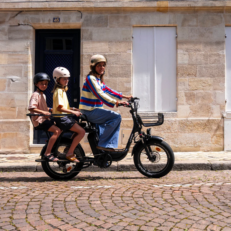 Une charge utile de 180 Kg maximum (hors poids du vélo) et une capacité de 60 Kg maximum sur le porte-bagage. Idéal pour un usage familial, il est équipé d’un porte-bagage arrière avec 2 emplacements pour transporter 2 personnes (adultes et/ou enfants) ou plusieurs sacs et colis volumineux. Il est également possible d’installer un rack avant pour un rangement supplémentaire. Le Jumbo pèse 32kg sans batterie.
